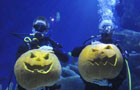 Divers Gareth Calvert (L) and Jamie Oliver pose with pumpkins after a race to carve them underwater in the Ocean Reef display at the London Aquarium, Oct 27, 2010.