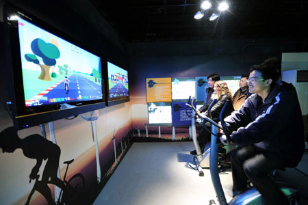 參觀者在杭州市氣象科普體驗館騎“風力自行車”,體驗不同風速下的騎行阻力。當天是世界氣象日,浙江省杭州市氣象科普體驗館正式開館。參觀者在這里可以了解氣象文化、氣象科普知識、重大氣象災害事件,并親身體驗與氣象有關的互動項目。 新華社發(fā)(李忠 攝)
